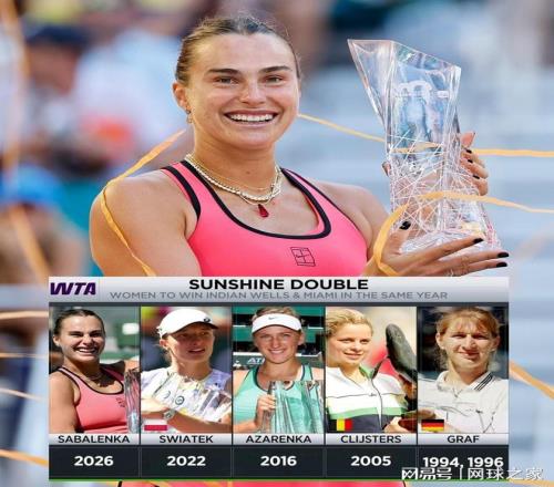 當薩巴倫卡在邁阿密硬地賽場舉起冠軍獎杯的那一刻,她對本賽季春季北美賽場完成了完美征服——背靠背拿下印第安維爾斯和邁阿密兩站WTA1000級別賽事,成為女子網壇曆史上第五位達成“陽光雙冠”的球員。這一成就的分量,在她年初澳網失利的背景下顯得尤為珍貴。然而,圍繞陽光雙冠與大滿貫孰難孰易的討論,也因此再度被點燃。