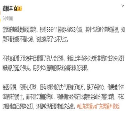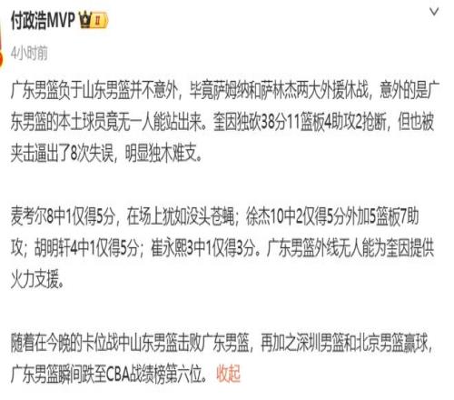 賽後媒體人付政浩談到了這個問題,並且指出了這個致命要害:廣東男籃負於山東男籃並不意外,畢竟薩姆納和薩林傑兩大外援休戰,意外的是廣東男籃的本土球員竟無一人能站出來。奎因獨砍38分11籃板4助攻2搶斷,但也被夾擊逼出了8次失誤,明顯獨木難支。