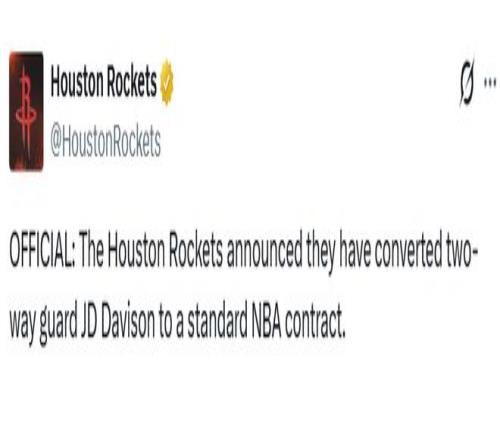 北京時間4月8日,火箭隊官方今日宣布,將雙向合同後衛JD-戴維森的合同轉為標準NBA正式合同。據此前報道,雙方簽下...