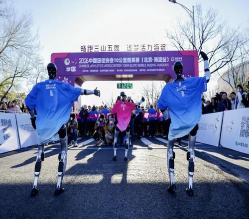 4月6日,機器人在為2026中國田徑協會10公裏精英賽(北京・海澱站)獻舞助威。新京報記者 浦峰 攝