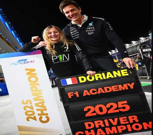 帶著這份浴火重生的心智,多瑞安在2025賽季火力全開,憑借8次登上領獎台(包括4次冠軍)的優異表現,她在拉斯維加斯收官戰的雨夜亂局中以第五名的成績力壓法拉利青訓車手瑪雅·維格,成功加冕2025賽季F1學院總冠軍。