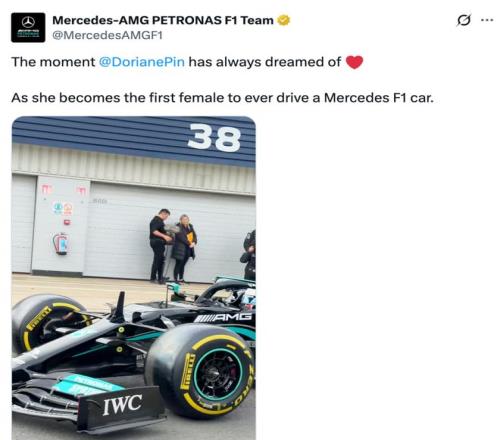 年僅22歲的法國女車手多瑞安·賓坐進了梅賽德斯W12賽車的駕駛艙,完成她職業生涯首次F1賽車測試。這不僅是她個人賽車生涯中一個重要裏程碑,同時也標誌著她成為梅賽德斯車隊曆史上第一位駕駛其F1賽車進行測試的女車手。