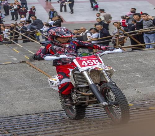 2011年9月26日,現張雪機車創始人張雪參加重慶雲陽摩托車城市登梯競技賽。視覺中國 圖