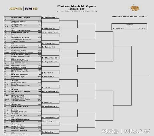 北京時間昨晚,WTA1000馬德裏站公布了單打正賽簽表,前八大種子的對位是,上半區,薩巴倫卡--鮑裏妮、斯瓦泰克--斯維托麗娜;下半區,佩古拉--高芙、阿尼西莫娃--萊巴金娜。