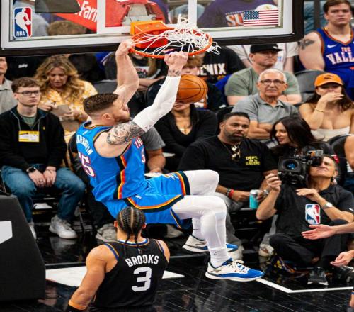 雷霆隊的亞曆山大得到42分、4個籃板和8次助攻,米切爾得到15分和6個籃板,卡魯索得到13分和5個籃板,霍姆格倫得到10分和7個籃板。太陽隊的布魯克斯得到30分和7個籃板,格林得到24分、5個籃板和6次助攻,布克得到16分、4個籃板和7次助攻,伊戈霍達羅得到15分,吉萊斯皮得到7分、10個籃板和5次助攻。