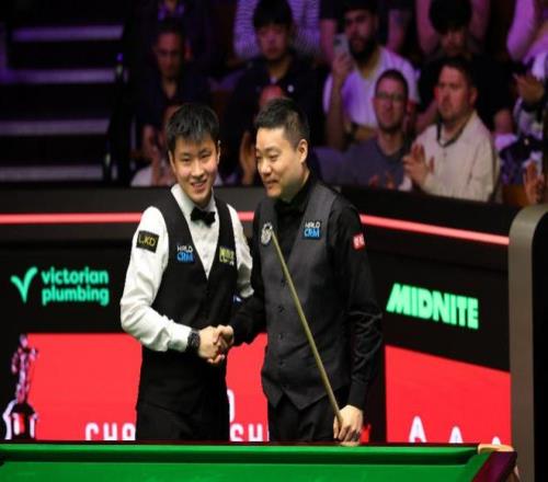4月26日,趙心童(左)和丁俊暉在世錦賽1/8比賽後握手致意。新華社發